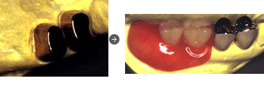治療開始 a.診査診断、設計、デザイン b.内冠の形成、型採り、噛み合わせチェック c.内冠の製作 d.内冠の試適、ピックアップ印象(型採り) e.義歯の型採り、噛み合わせチェック f.義歯の排列、試適 g.内冠装着、コーヌス義歯完成 |